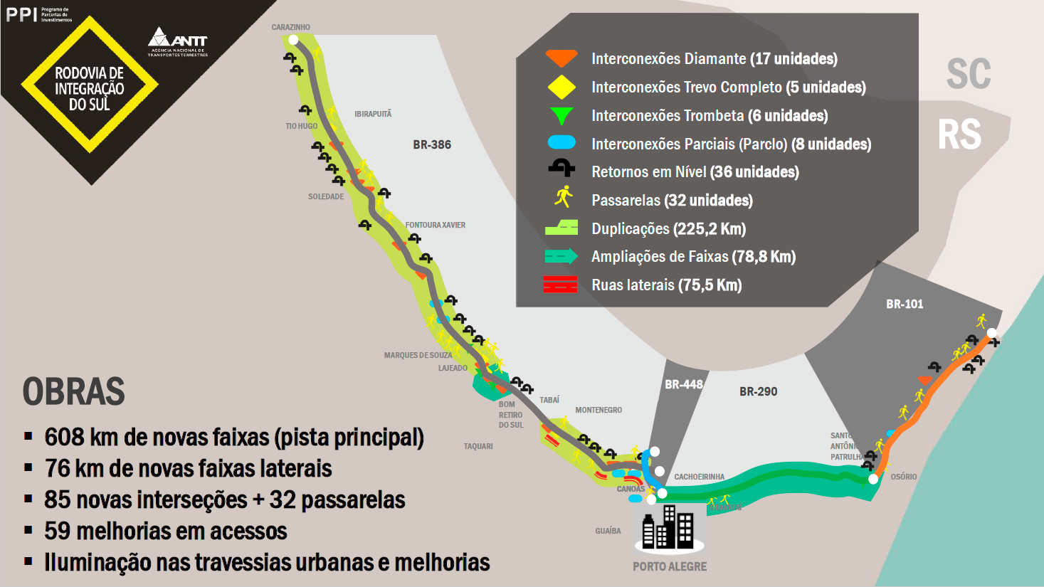 TRECHO – Os trechos a serem concedidos são: BR-101/RS, entre a divisa SC/RS até o entroncamento com a BR-290 (Osório); BR-290/RS, no entroncamento com a BR-101 (Osório) até o km 98,1; BR-386, no entroncamento com a BR-285/377 (Passo Fundo) até o entroncamento com a BR-470/116 (Canoas); e BR-448, no entroncamento com a BR-116/RS-118 até o entroncamento com a BR-290/116 (Porto Alegre).